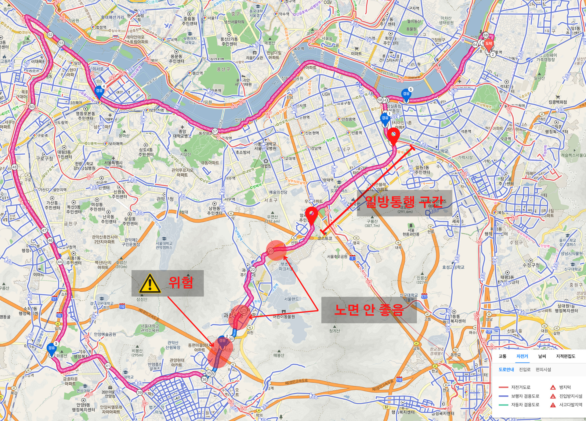 제가 과천시를 통과하기 싫은 가장 큰 이유는, 지도 상에서 위험이라고 표시한 구간입니다.