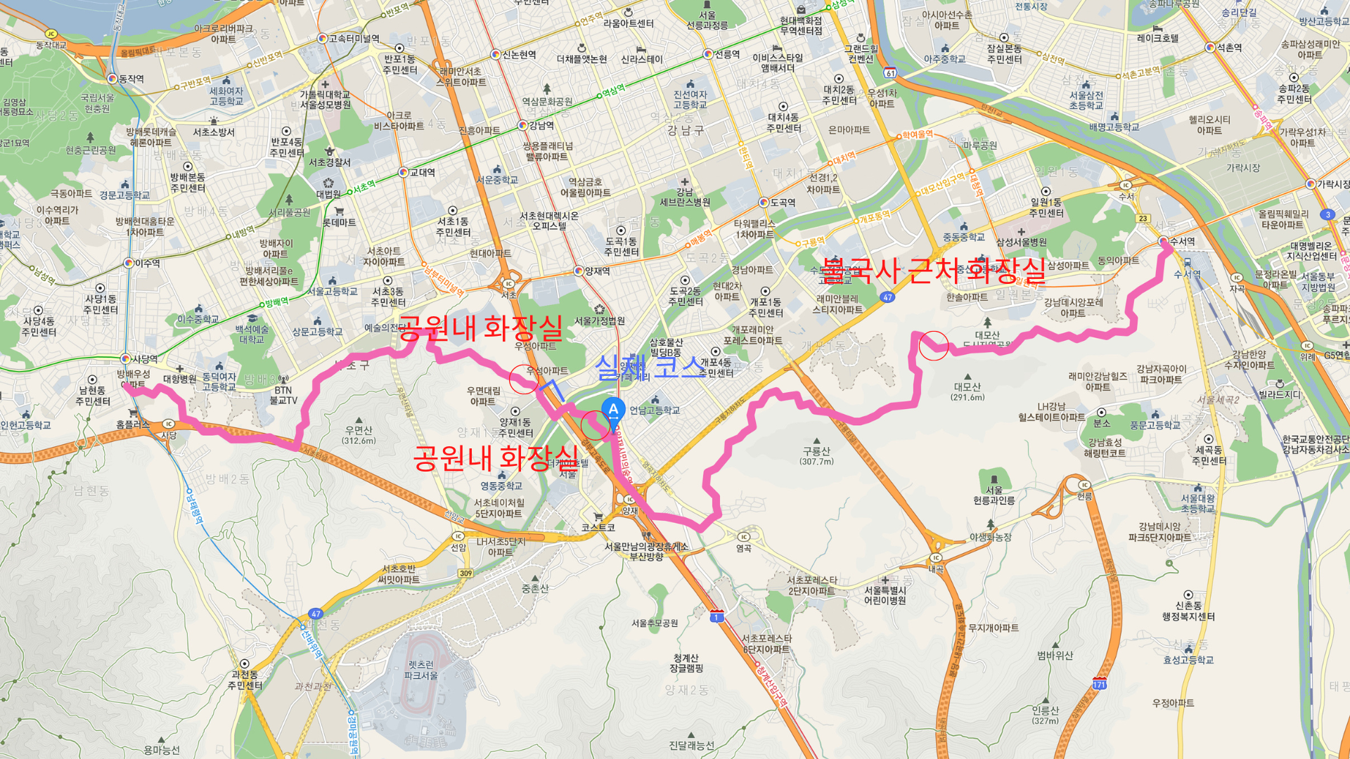 불국사 근처에 하나 있어요. 그리고 양재시민의숲까지는 와야 화장실이 있습니다. 그 사이에 약수터도 있긴한데.. 딱히 마시고 싶은 생각은 안 들어요.