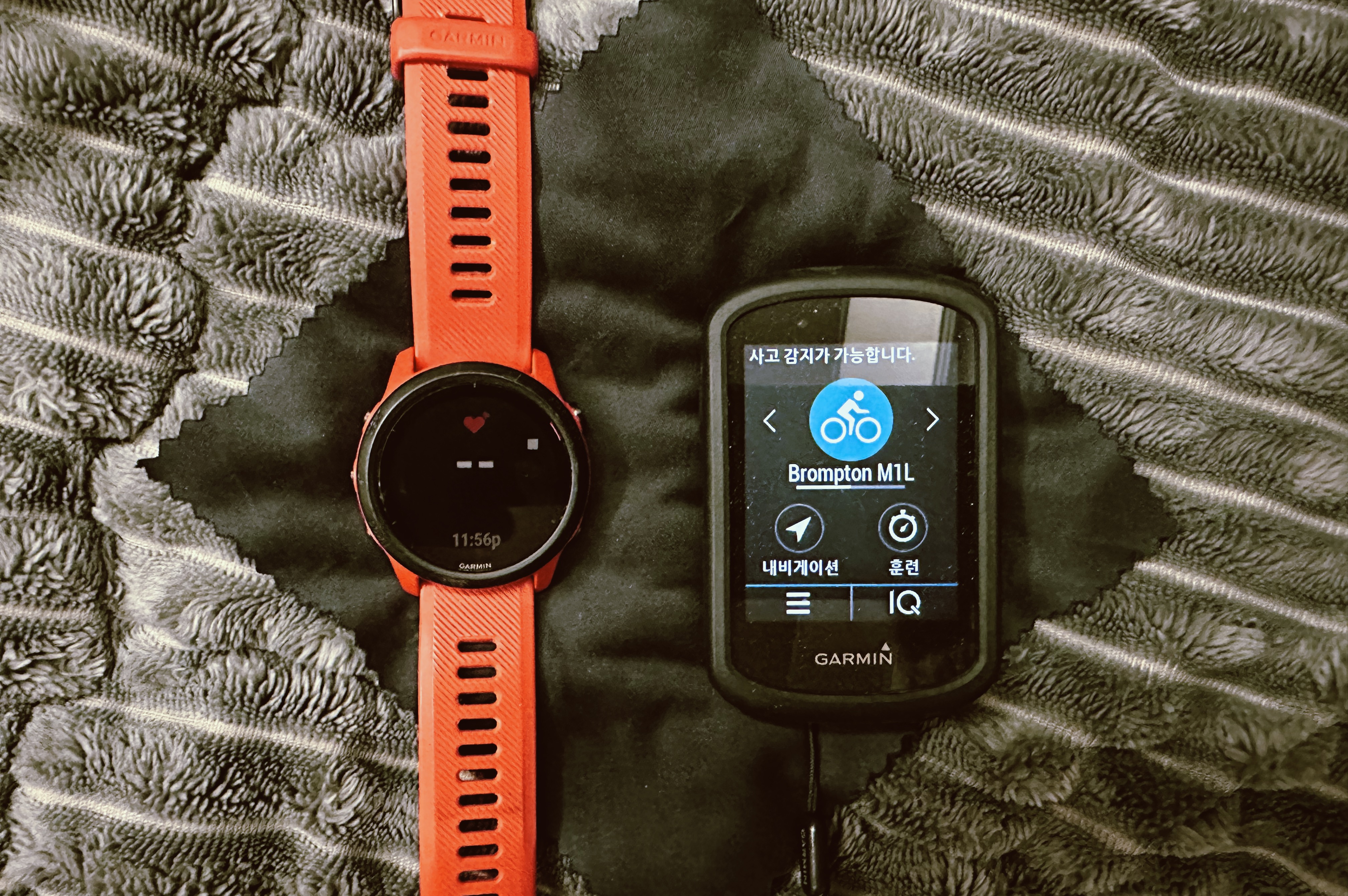 왼쪽이 가민 포러너 745 (심박수 전송 모드 상태 ) 왼쪽이 가민 엣지 830입니다.