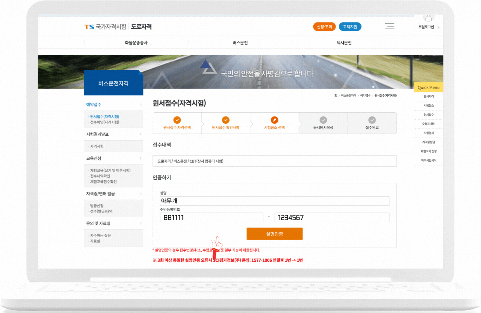 4) 시험장소 선택 / 실명인증