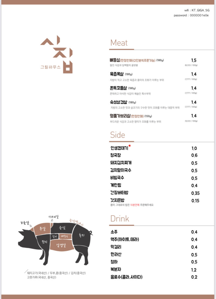 1) 삼겹살 1인분 - 14,000원이고 일부 특수부위 제외하고 모두 14,000원입니다. 하나만 15,000원인가 그래요.