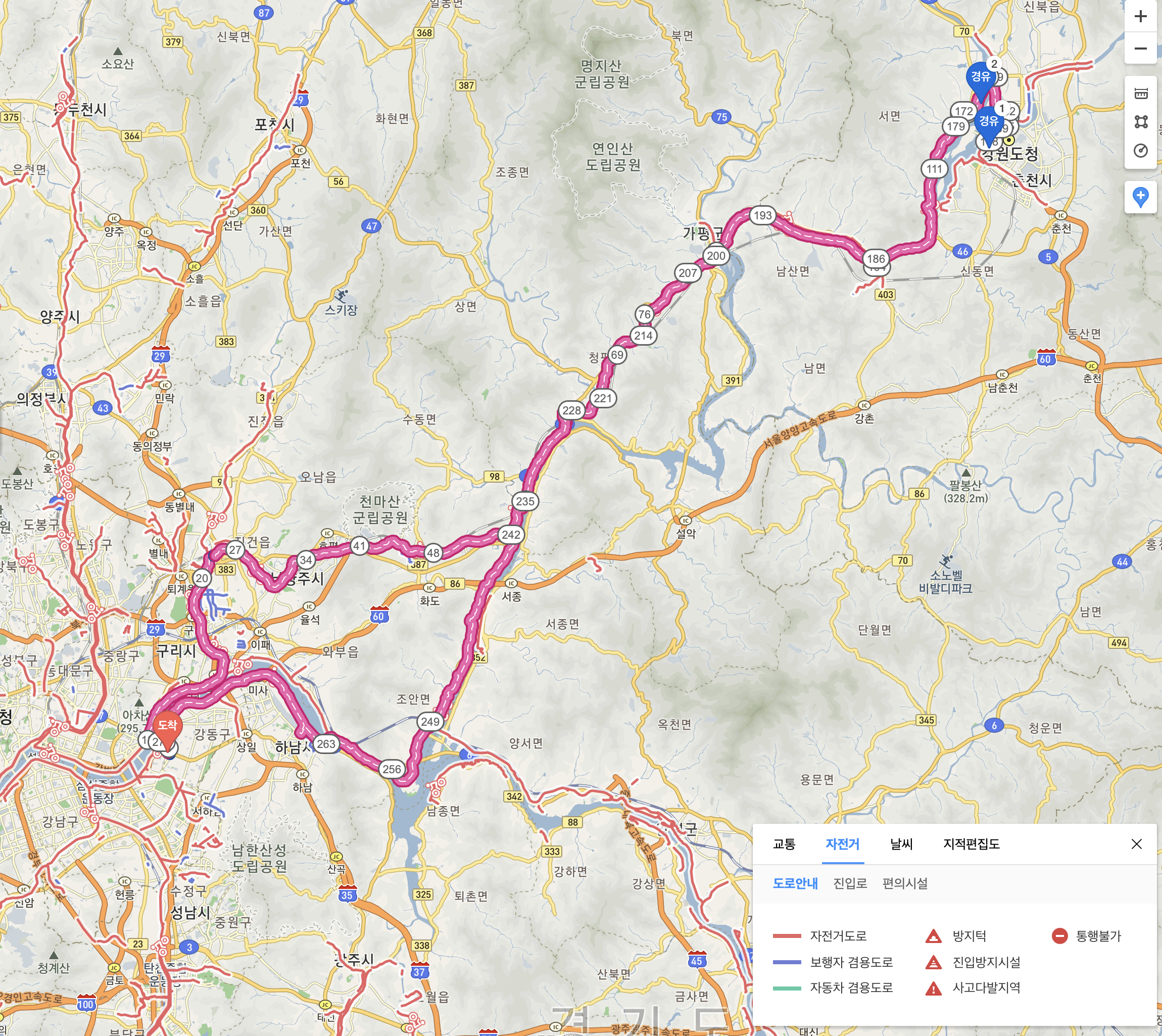 1) 서울 강동 - 춘천 왕복 코스 중에 유별난 업힐도 없고 무난하게 다녀올 수 있는 코스입니다. 업힐이라고 하면 팔당 가기전에 아이유 고개 정도가 되지 않을까 합니다.
