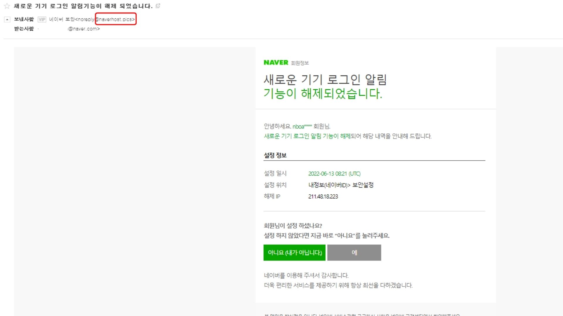 이번에는 '새로운 기기 로그인 알림 기능이 해제되었습니다'라고 피싱 이메일(Phishing Email)을 보냈는데요.