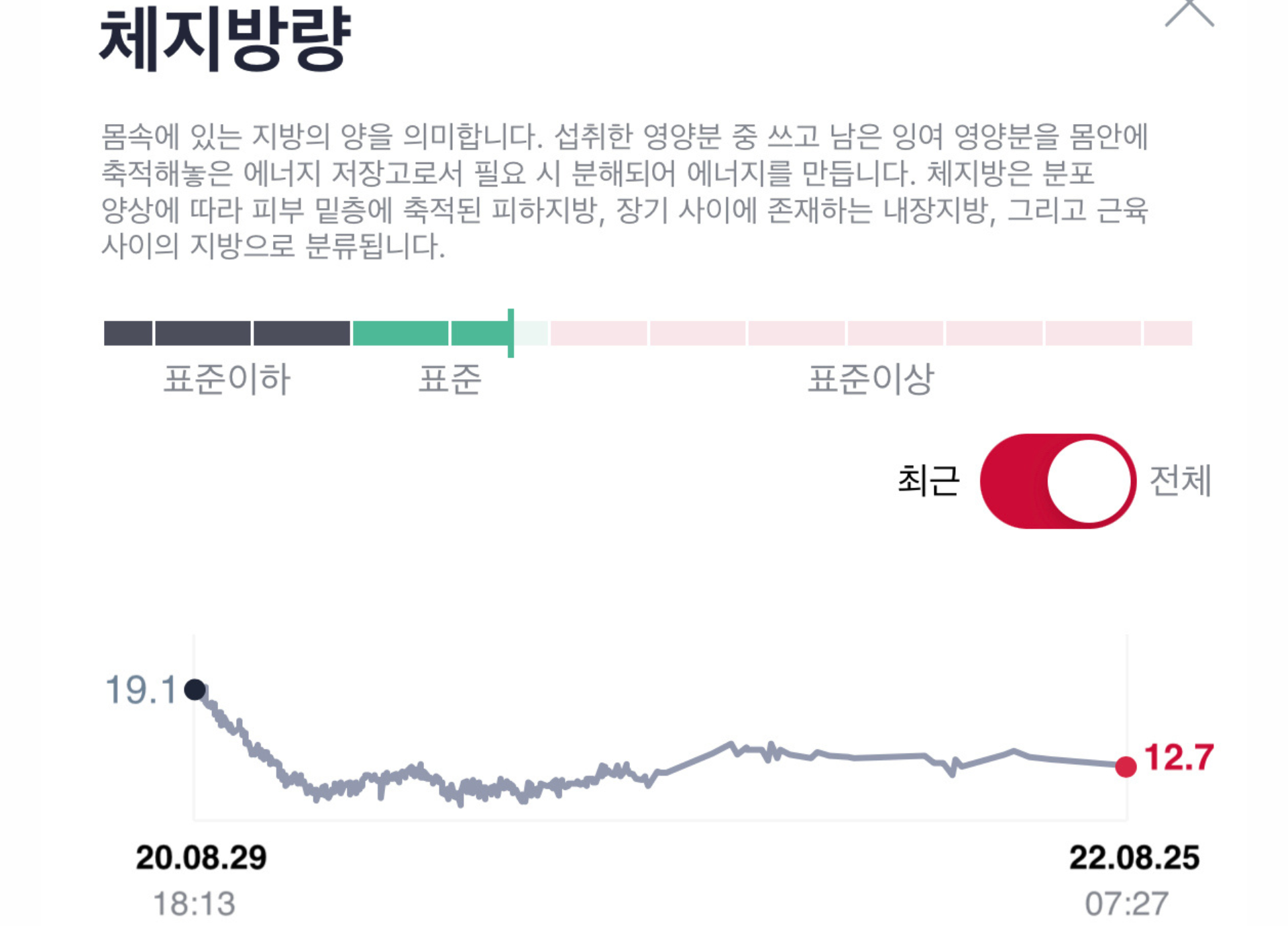 체지방률은 26.8%에서 15% 정도까지 찍다가.. 현재 19.8%.. 대략 20% 정도를 유지중입니다.
