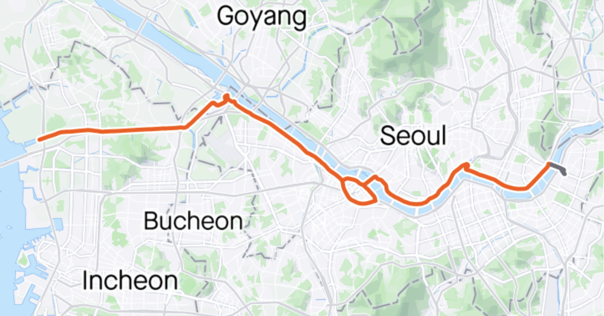 2. 코스 : 천호역 사거리 - 광진교 북단 - 마포대교 - 여의도 - 여의도 샛강 - 아라뱃길 - 여의도 - 마포대교 - 광진교 - 천호역 사거리