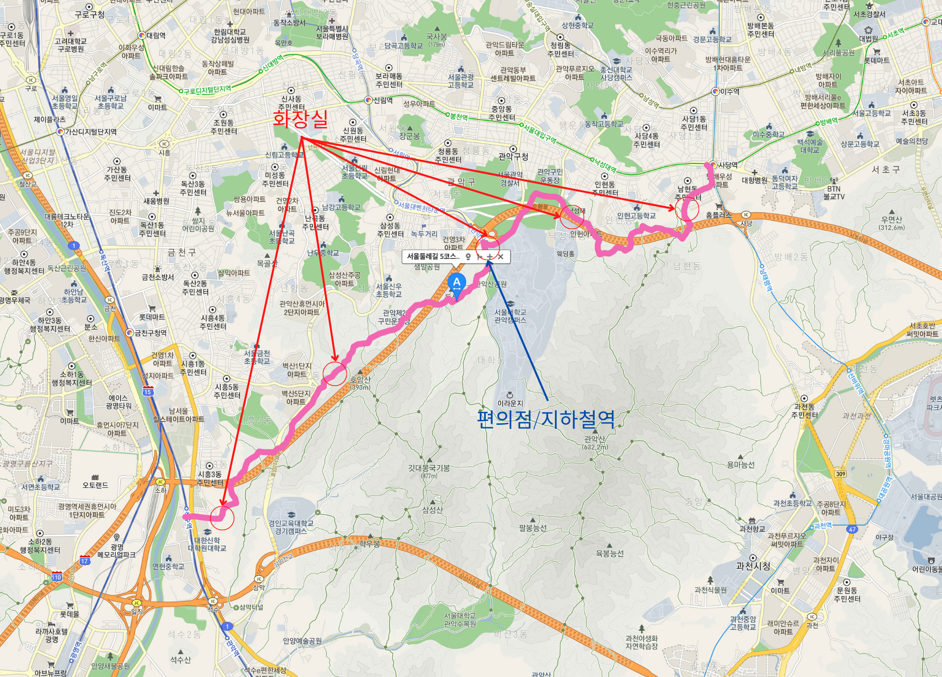 보시는 것처럼 주황색 리본이 코스간 보이실거에요. 저 리본만 찾아 가면 됩니다. 사당역 4번 혹은 5번 출구로 나오시면 됩니다.