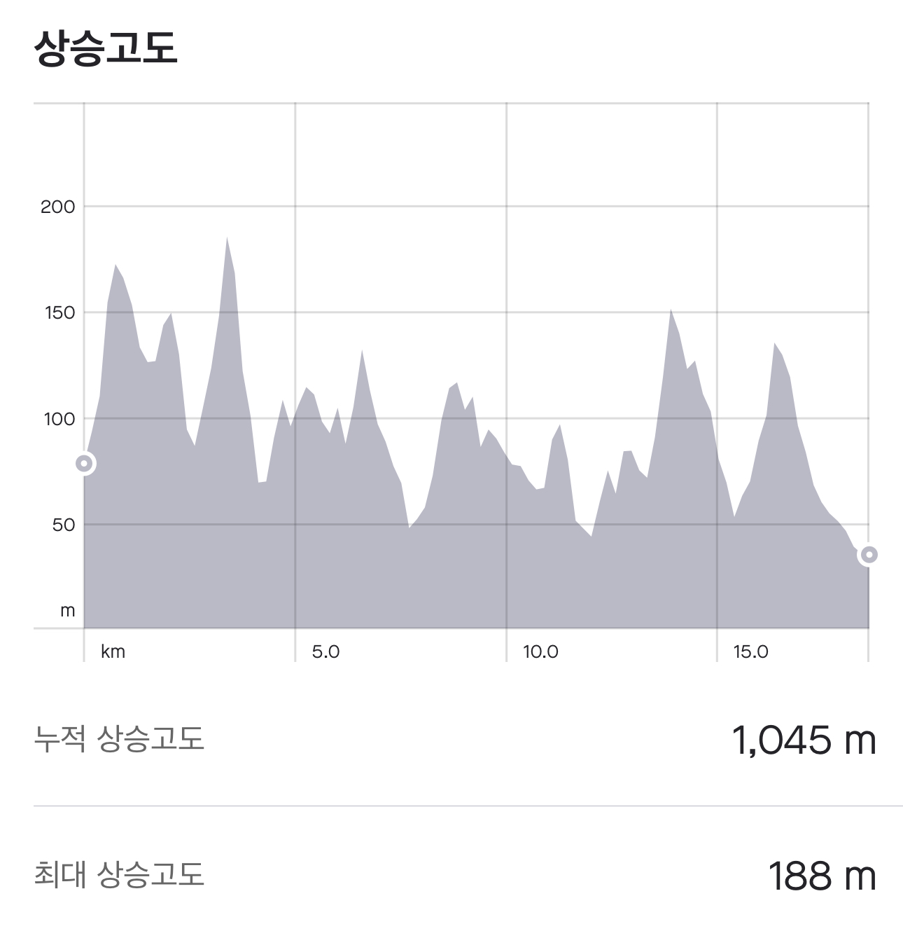 3. 총 거리 및 누적 상승 고도 : 18.61km 정도. / 누적 상승 고도 1,045m