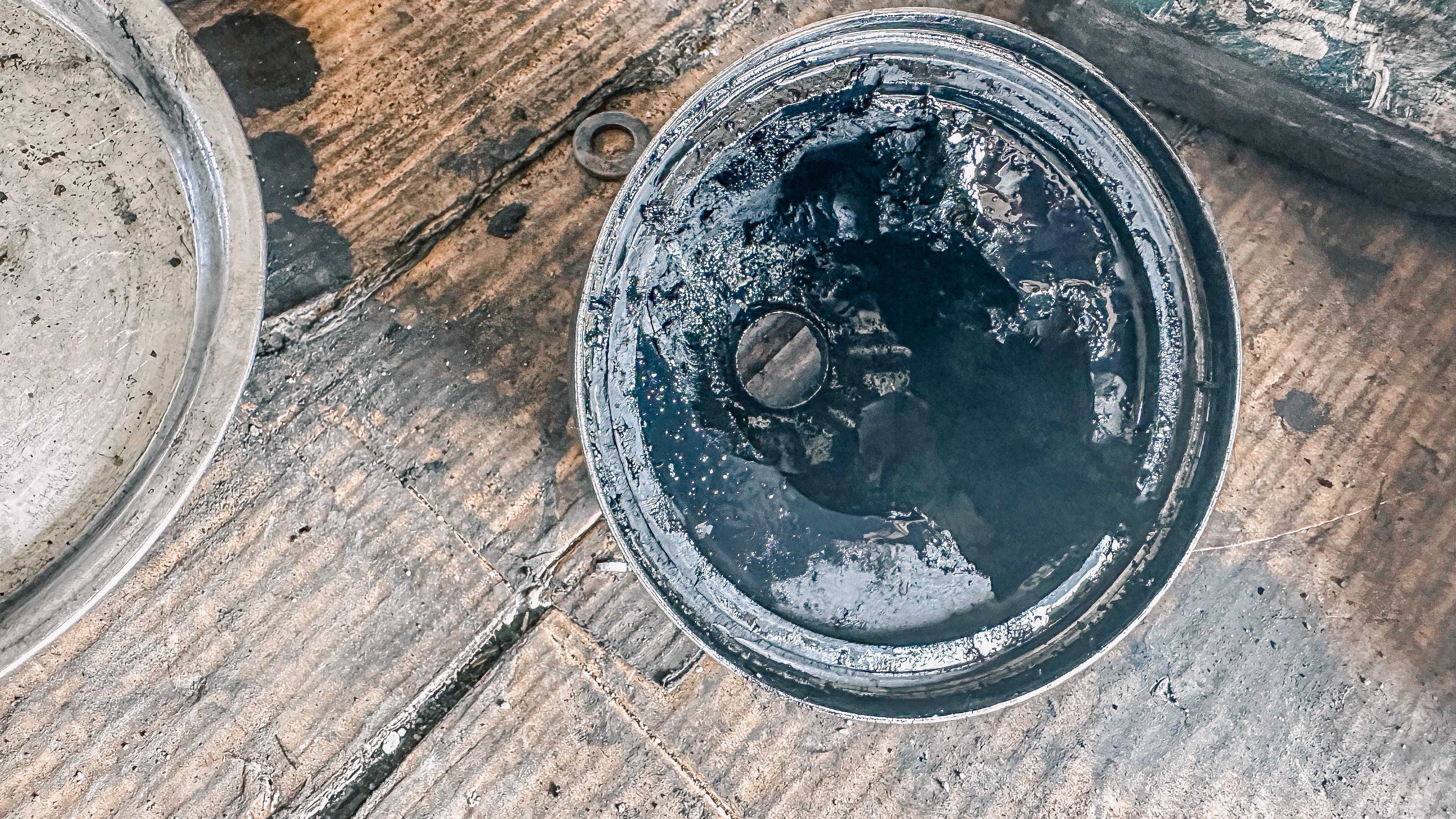 큰 깡통 두개에 기존 엔진 오일을 받아내고 있어요.