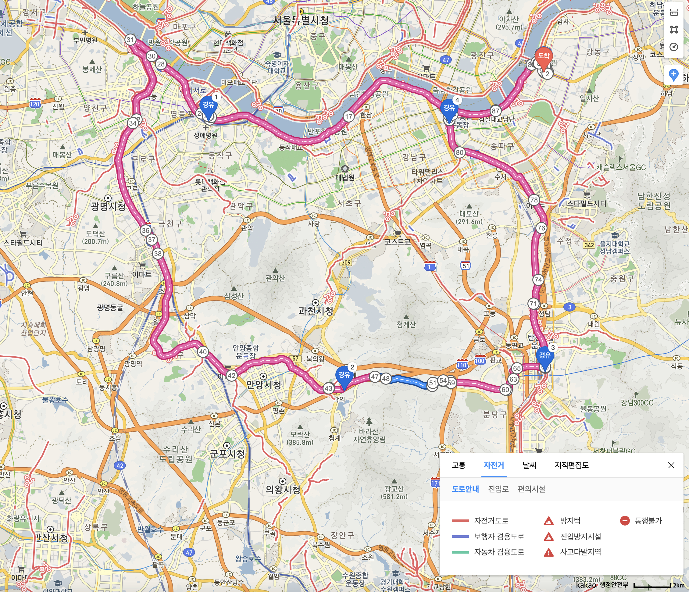 2) 청계산을 넘어오면서 구도로가 아닌 신도로로 다음맵이 안내를 하는 바람에, 신도로를 타고 가는데 문제는 중간에 자전거 도로가 끊기고 공도로 타게 되더라구요. 길도 넓고 바닥에는 작은 돌과 자동차 사고 파편으로 인해 행여 타이어 펑크가 걱정되더라구요. 빠른 속도로 지나가는 차량도 겁이 나고요. 게다라 1단 기어 변속시 트러블이 발생해서 2단으로 올라오게되는 불상사가........