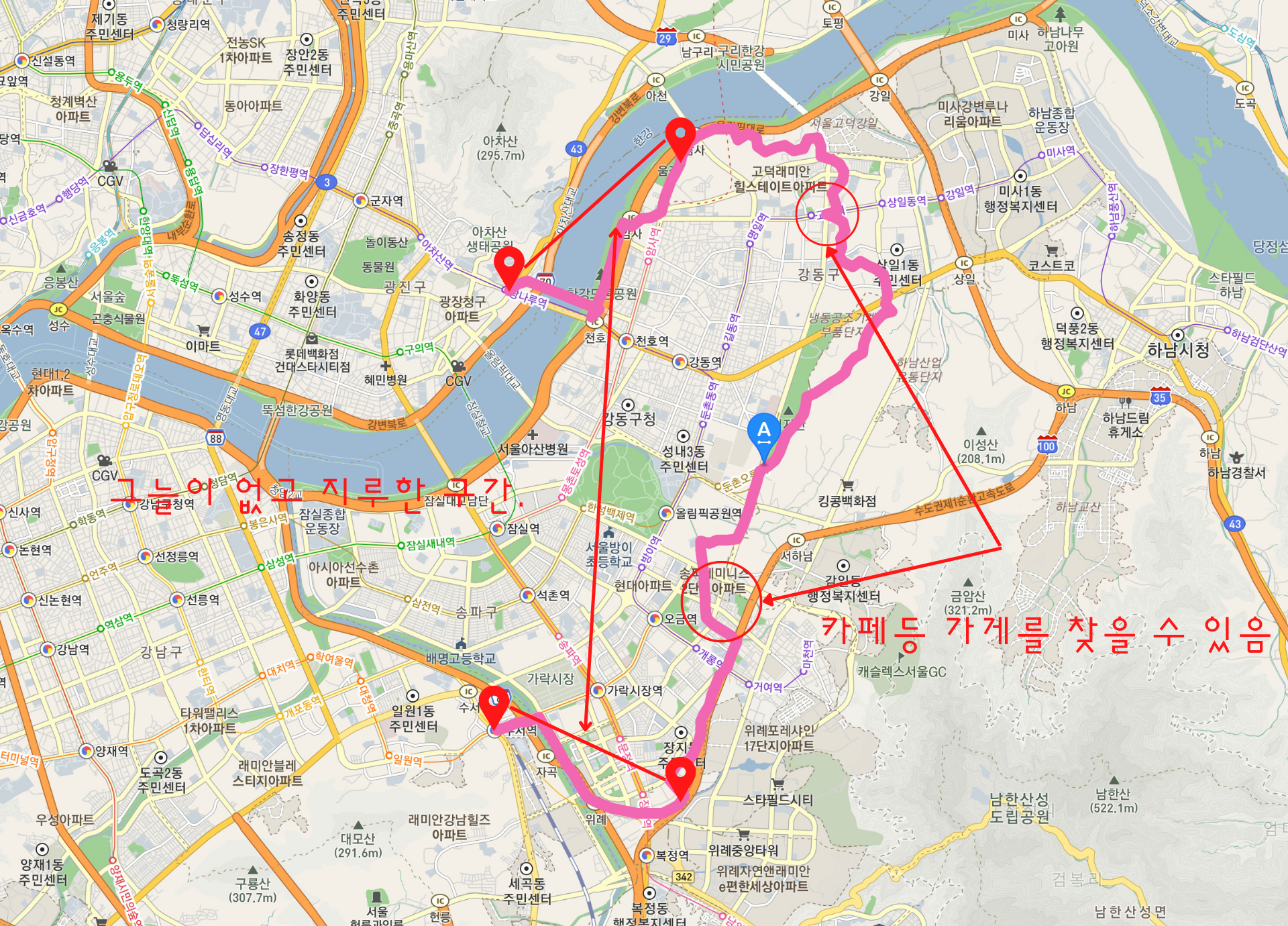 수키로를 걸어서 명일역 부근까지 가면, 이마트도 있고 카페도 있어서 잠깐 휴식이 가능하기도 합니다.