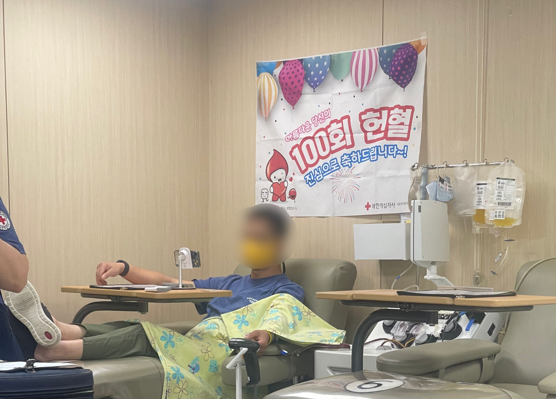 매번 같이 헌혈하는 지인은 7월 9일 헌혈로 총 100회 헌혈을 마쳤습니다.