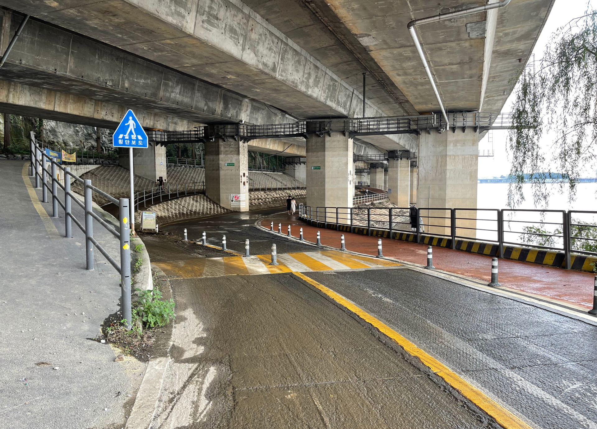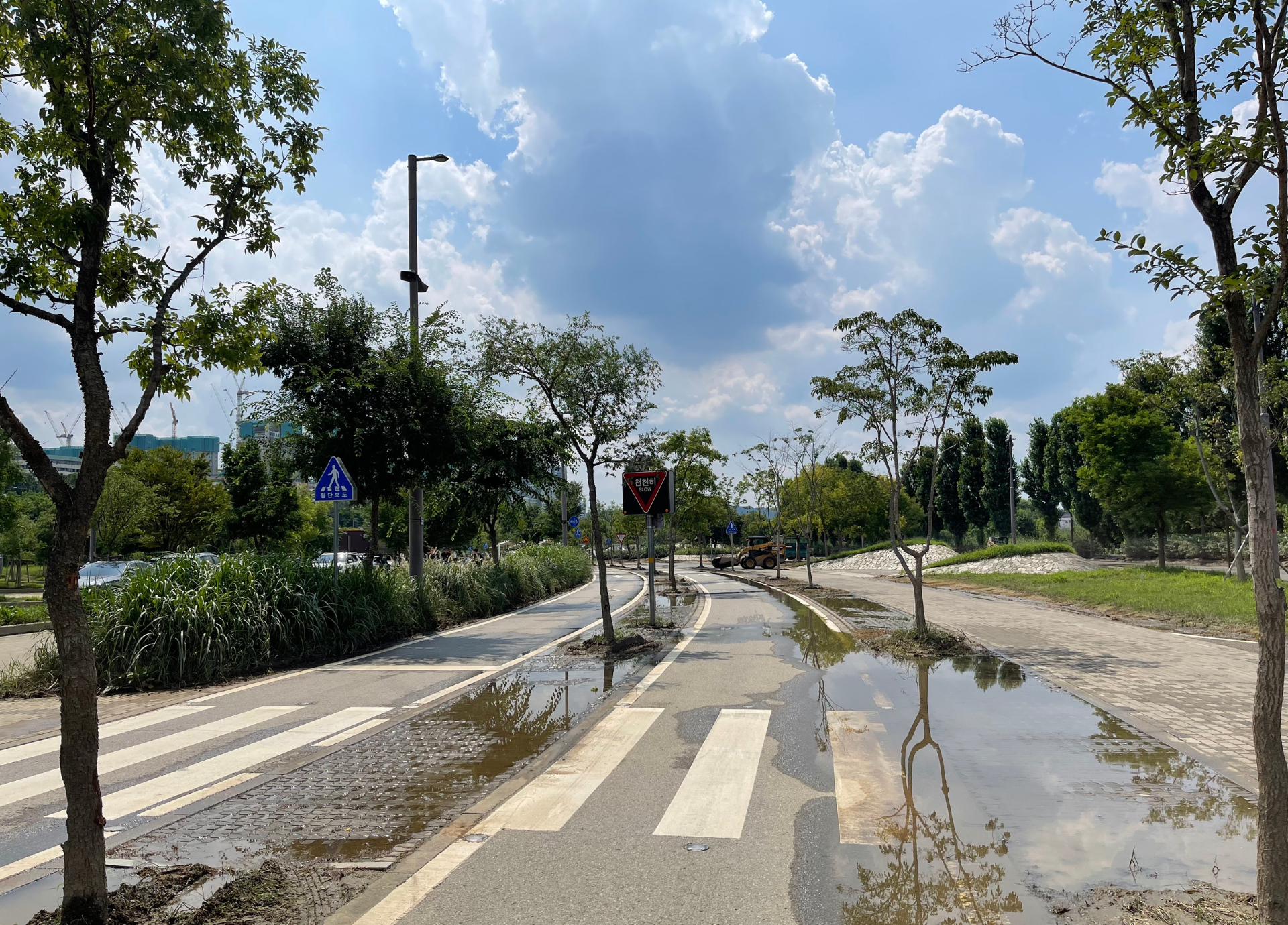 사진에는 자전거 도로 가에만 물이 고여있는데 자전거 도로 전체에 물이 고여있는 구간도 있습니다.