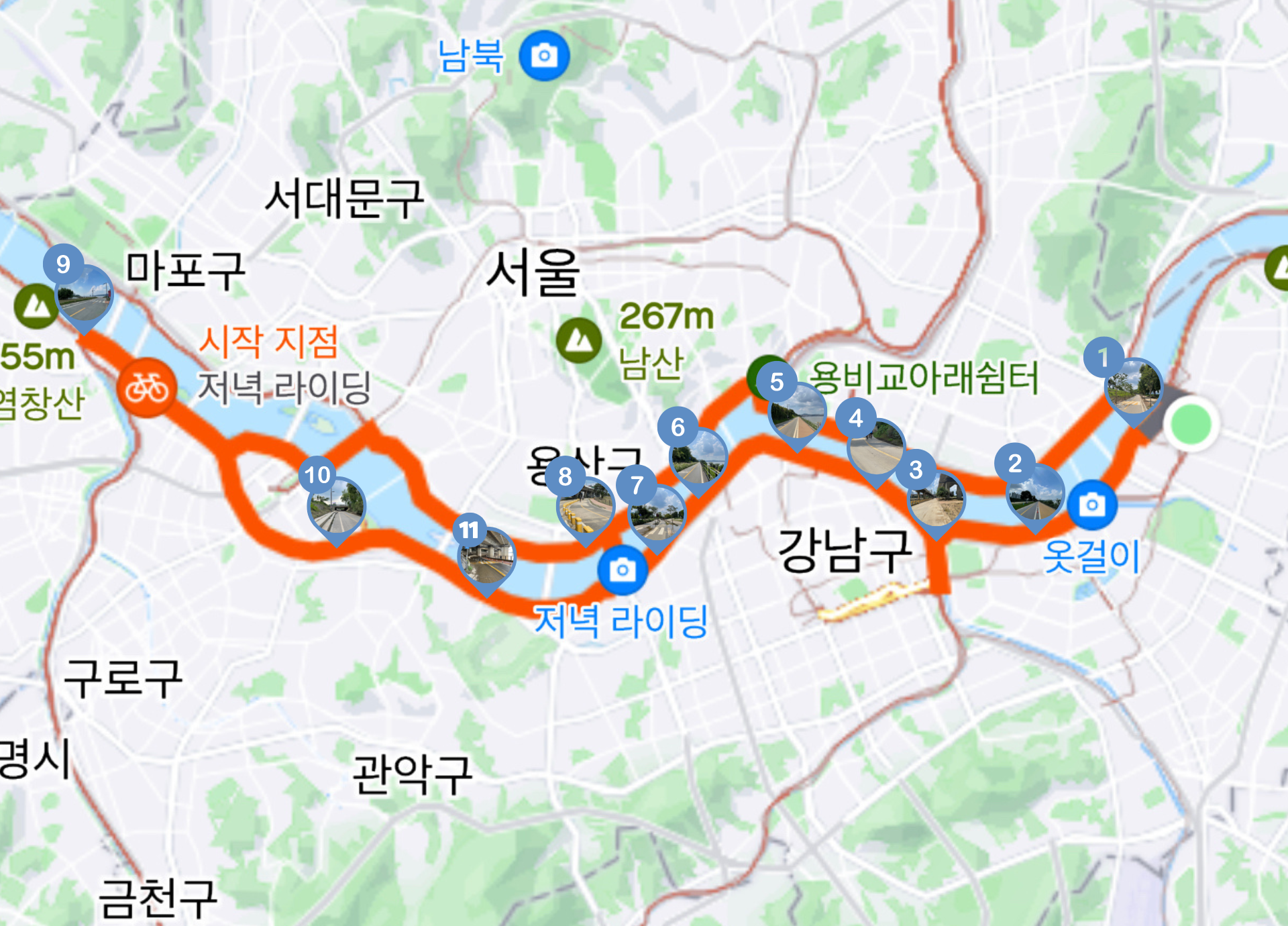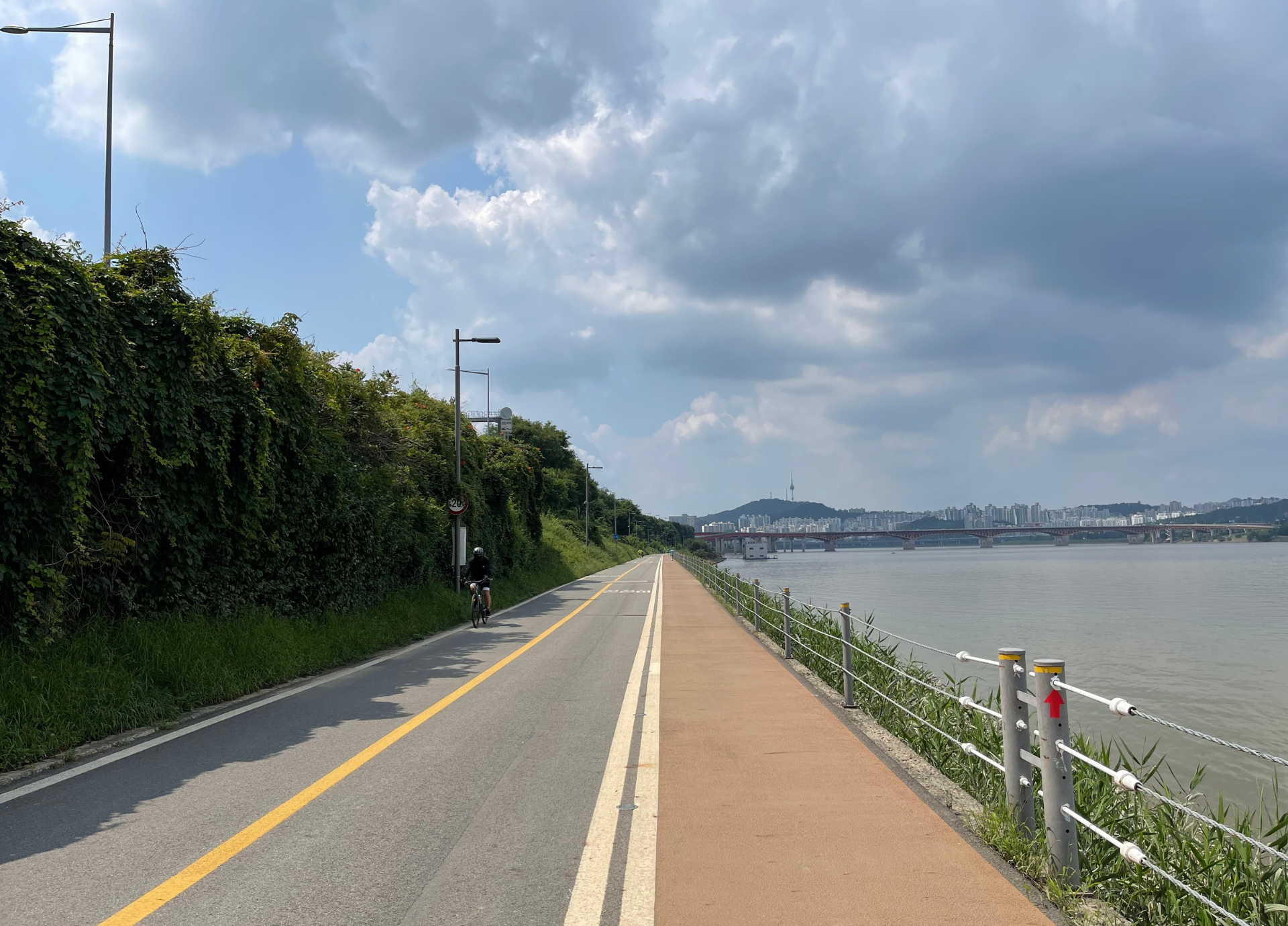 이후로 다시 잠수교를 건너서, 강변북로변을 따라 한강 자전거길을 타고 이동했습니다.