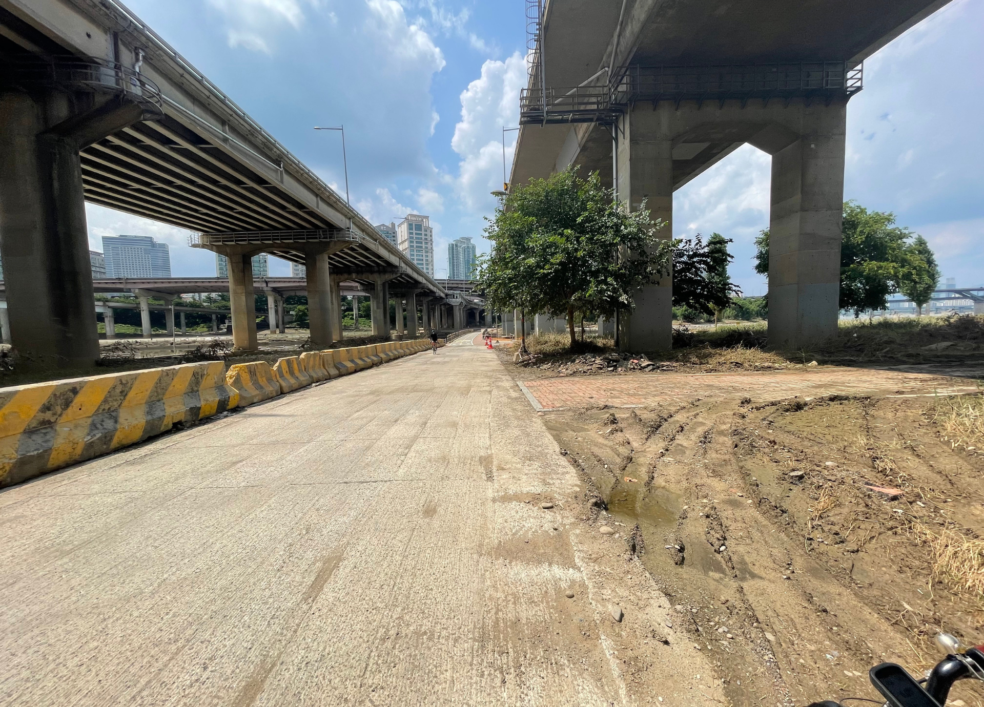 강동 풍납토성나들목에서 바라본 자전거 도로 현황입니다. 도로 좌우에는 아직 진흙이 살짝 남아있지만, 전체적으로 도로 상태는 양호합니다.
