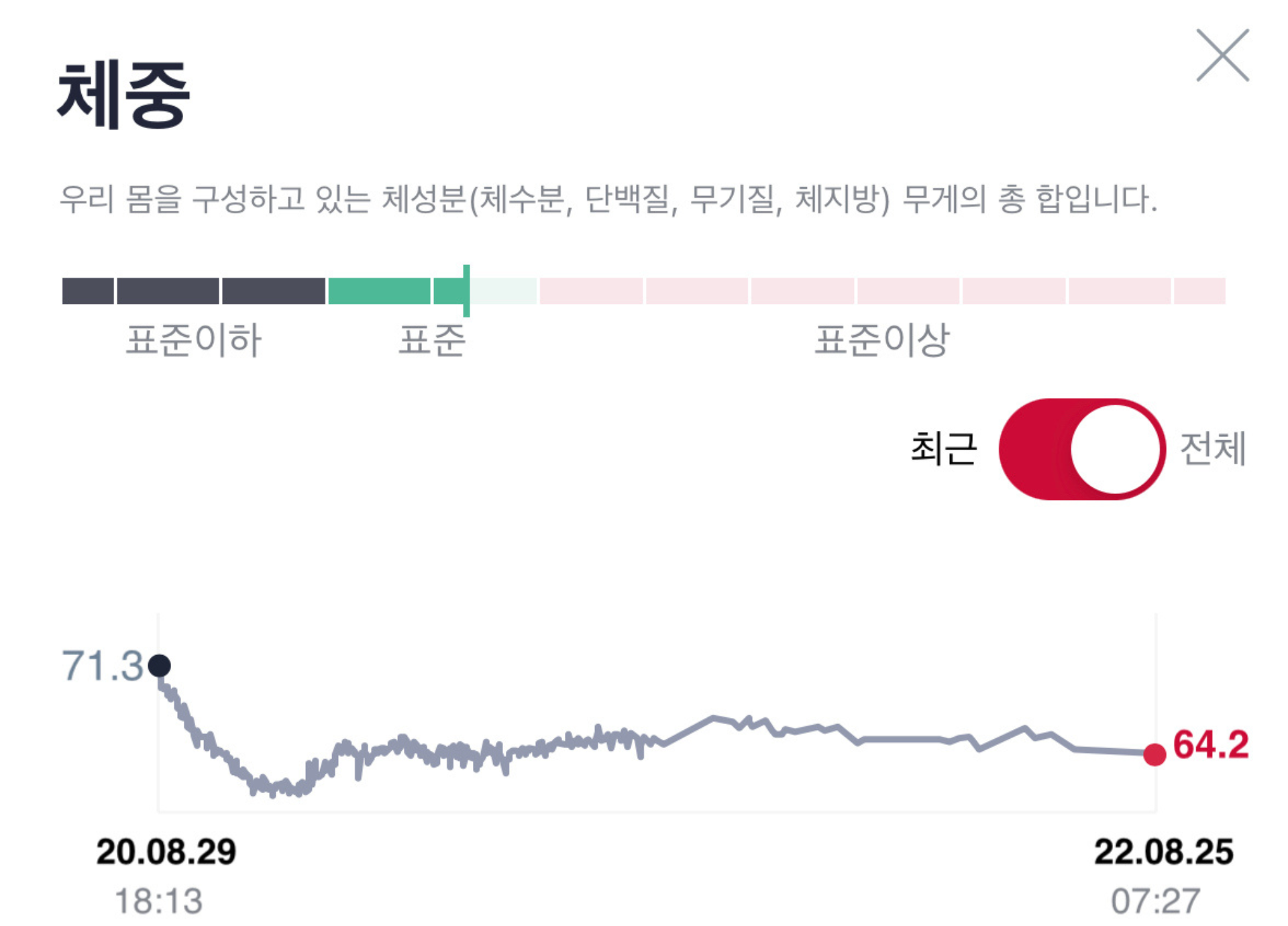 체중은 71.3kg에서 61kg 까지 내려갔다가... 64kg대를 유지하는 중입니다.