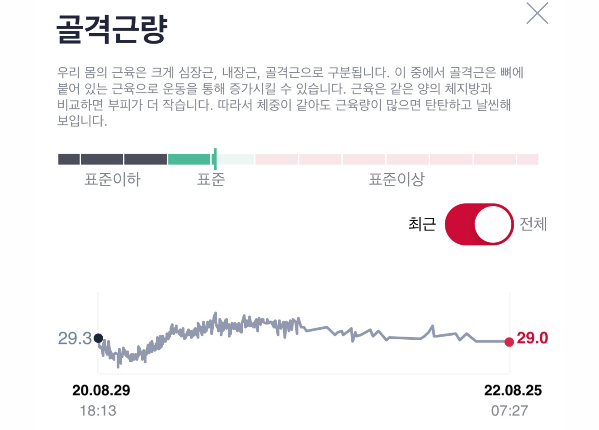 골격근량은 도데체 왜 시작점보다 줄었는지 이해는 못하겠지만... 비슷하게 유지하는 중입니다.