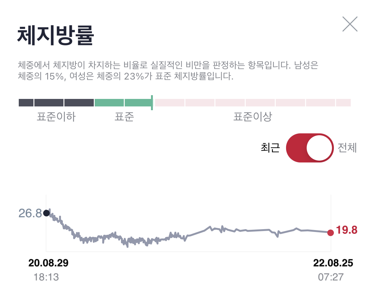 체지방률은 26.8%에서 15% 정도까지 찍다가.. 현재 19.8%.. 대략 20% 정도를 유지중입니다.